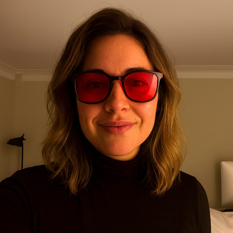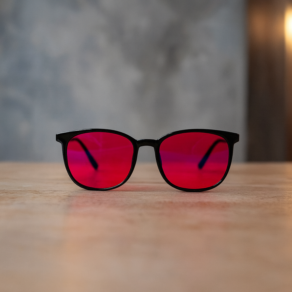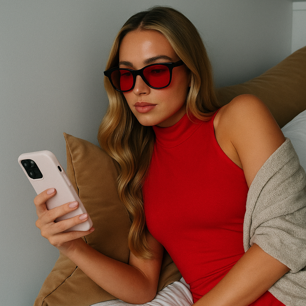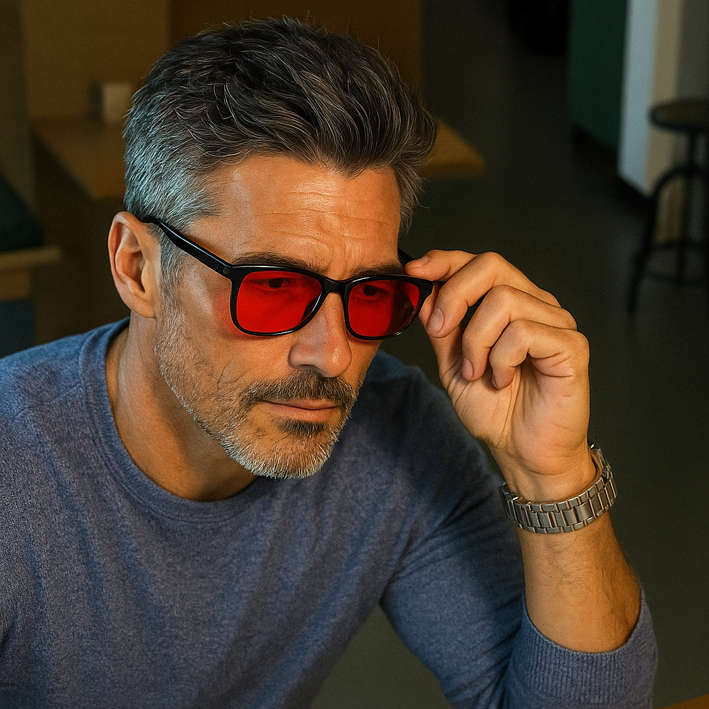 Red lenses block harsh blue light from screens — easing eye strain, improving sleep, and boosting your energy.