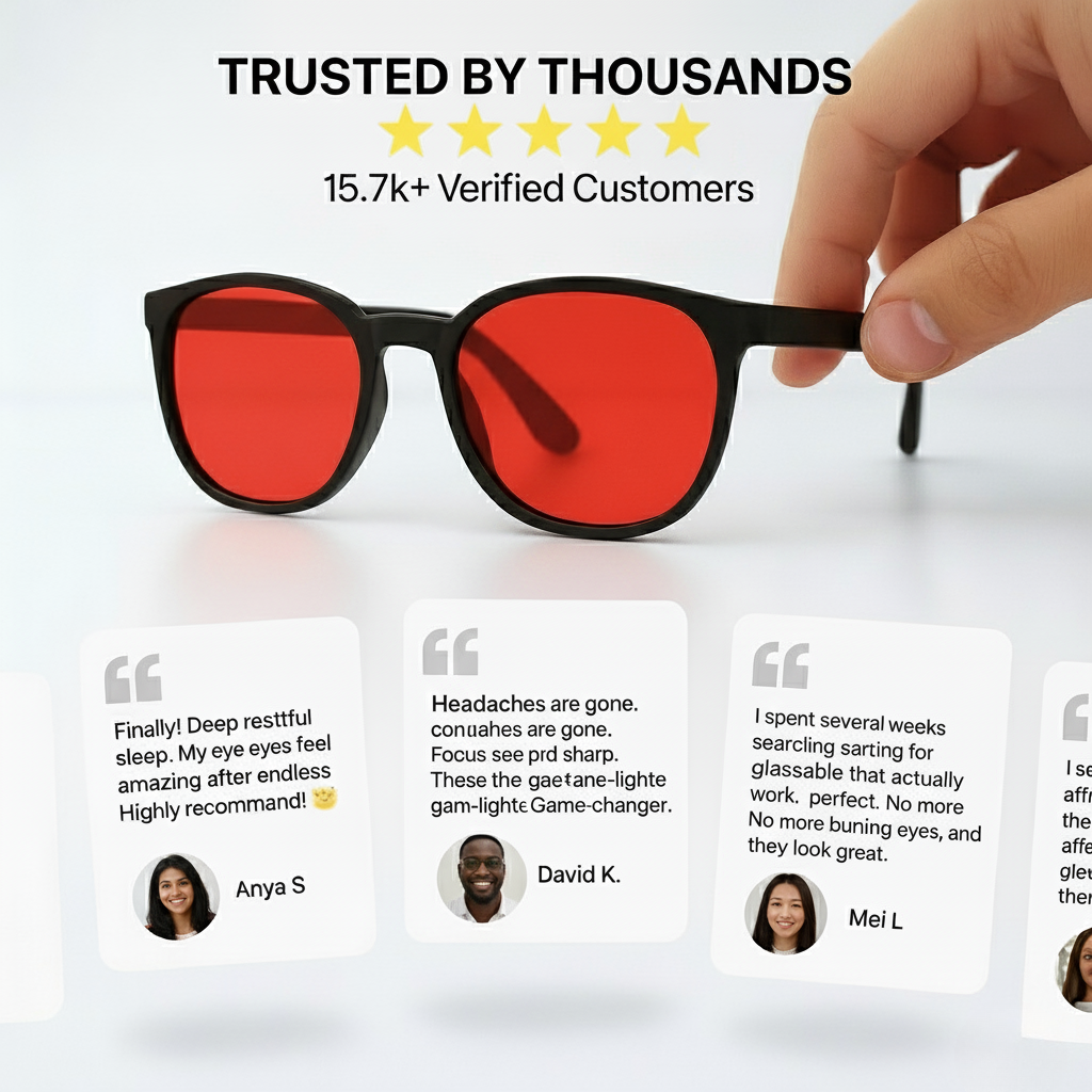 Red-tinted lenses filter out disruptive blue light, helping your eyes relax, your mind recharge, and your sleep improve naturally.